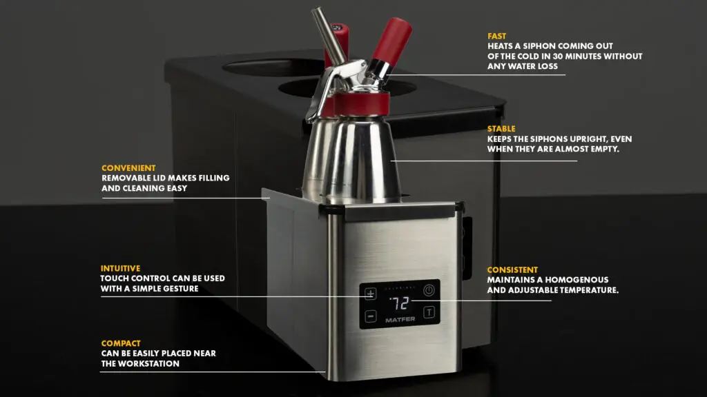 The Matfer Siphon Heater was born from a simple observation : current solutions for keeping siphons at temperature are often bulky, imprecise, and poorly suited to the fast pace of service.